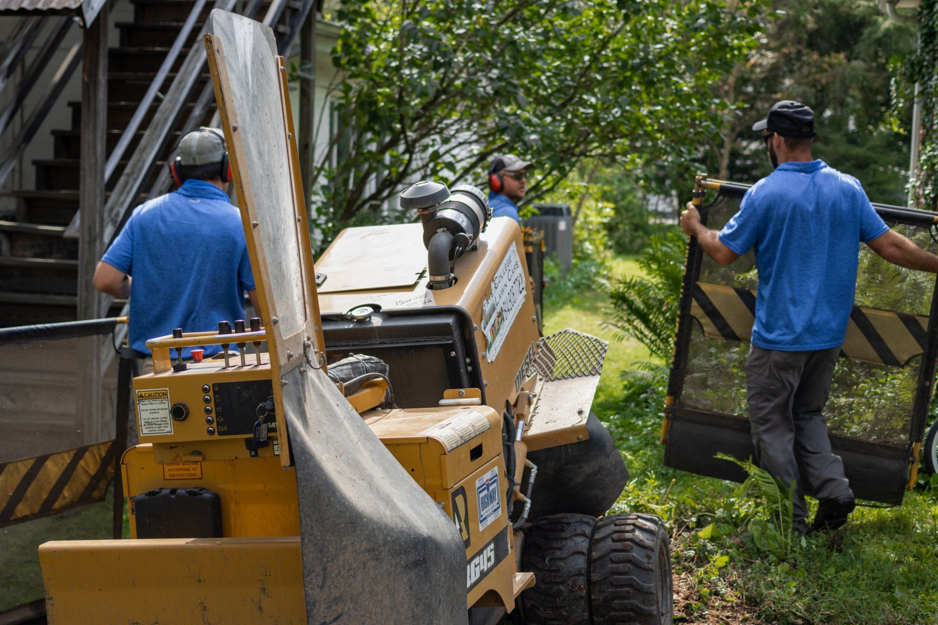 Most stump removal projects are completed in one day. After the quote process, our team will arrange a date and time to remove your stump and repair your lawn. The process includes three teams that arrive at the work site one at a time. The first team grinds the stump. The second team cleans the site. And the final team soils and seeds the treatment site.