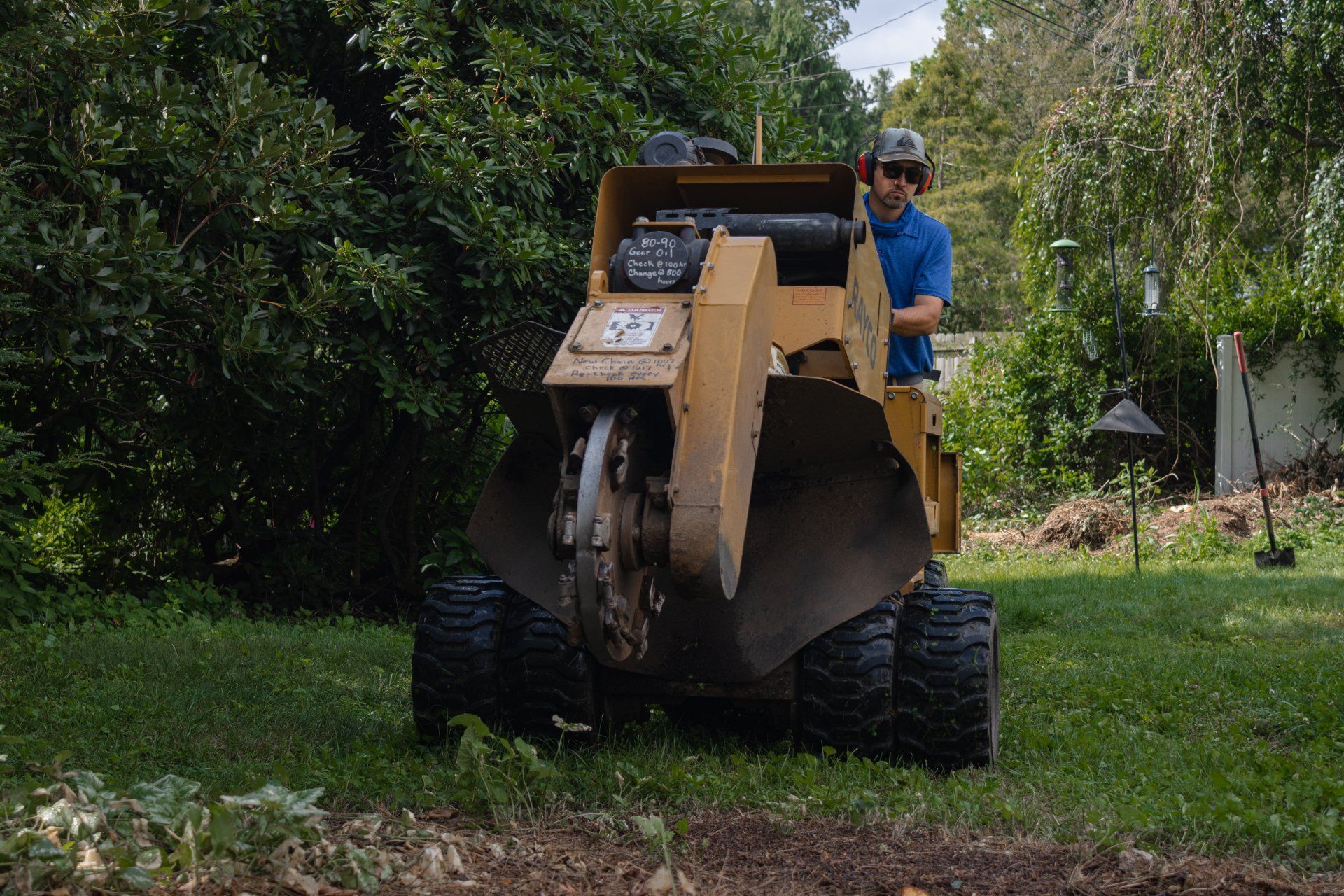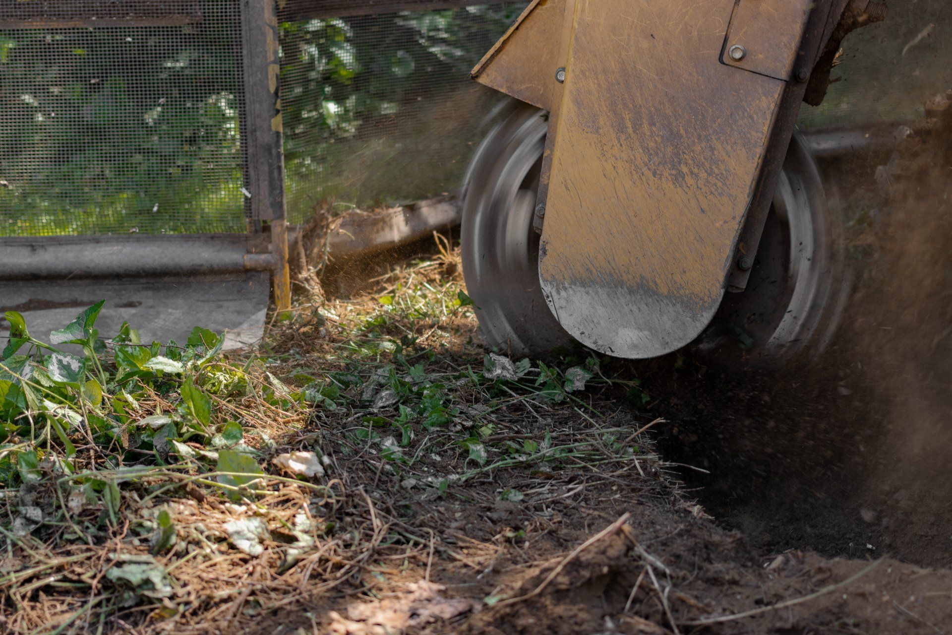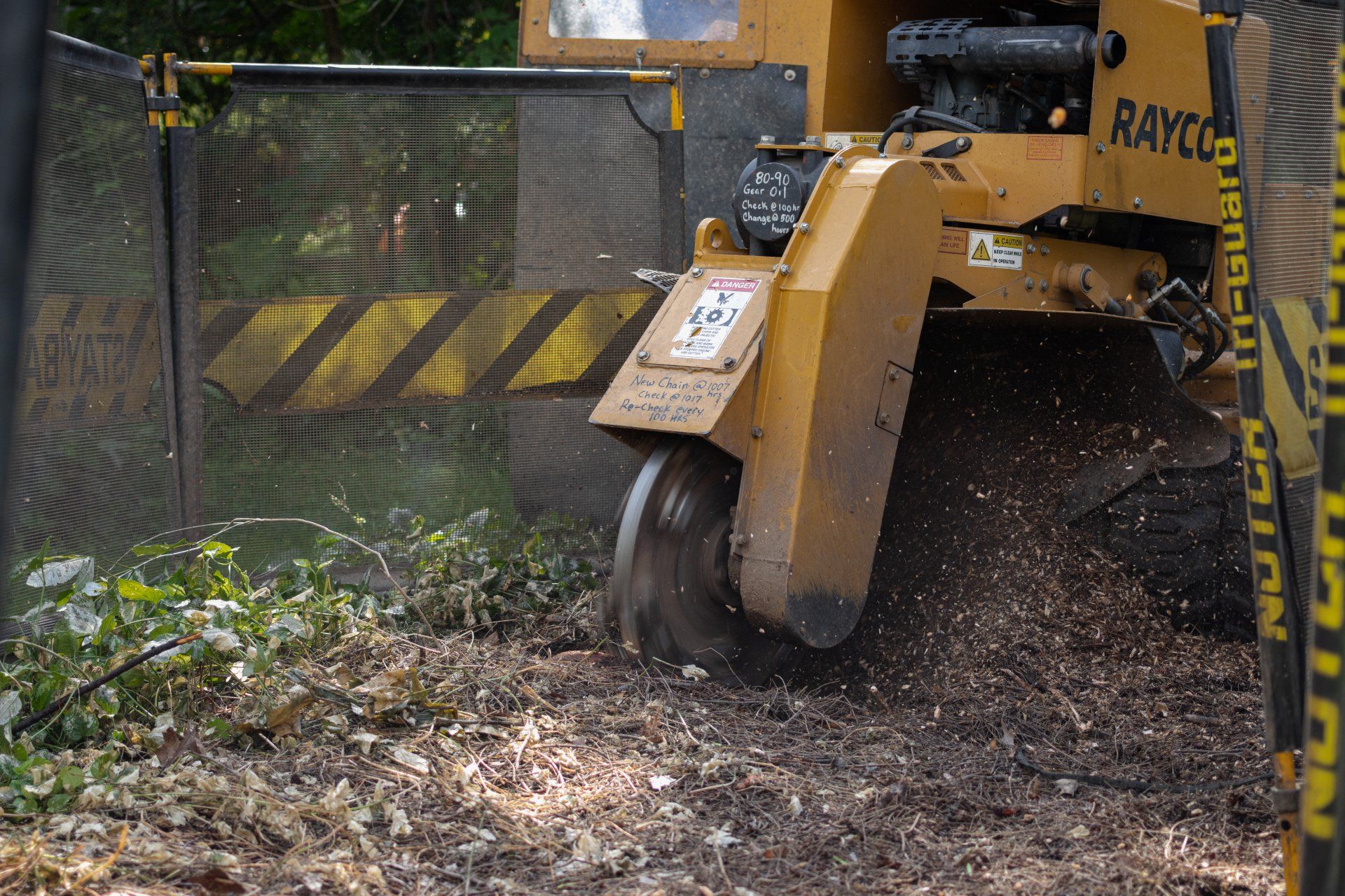 A spinning disc, made of special tungsten carbide "teeth," cuts into the stump in a sweeping motion, grinding the stump into small wood chips.