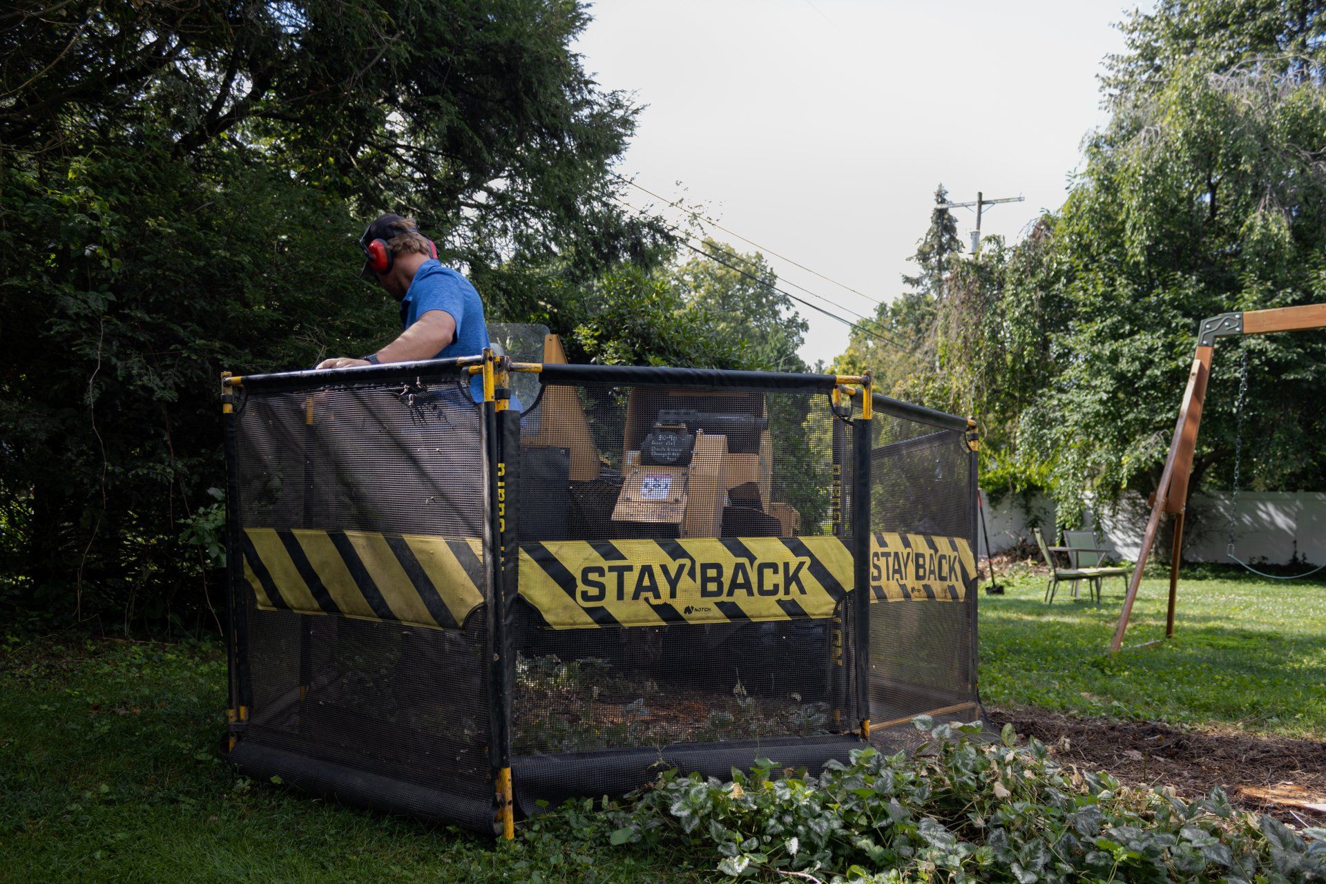 Screens are set around the stump removal site to aid safety and cleanliness. As a barrier of protection, the screens also prevent wood chip debris from being scattered around the surrounding areas.